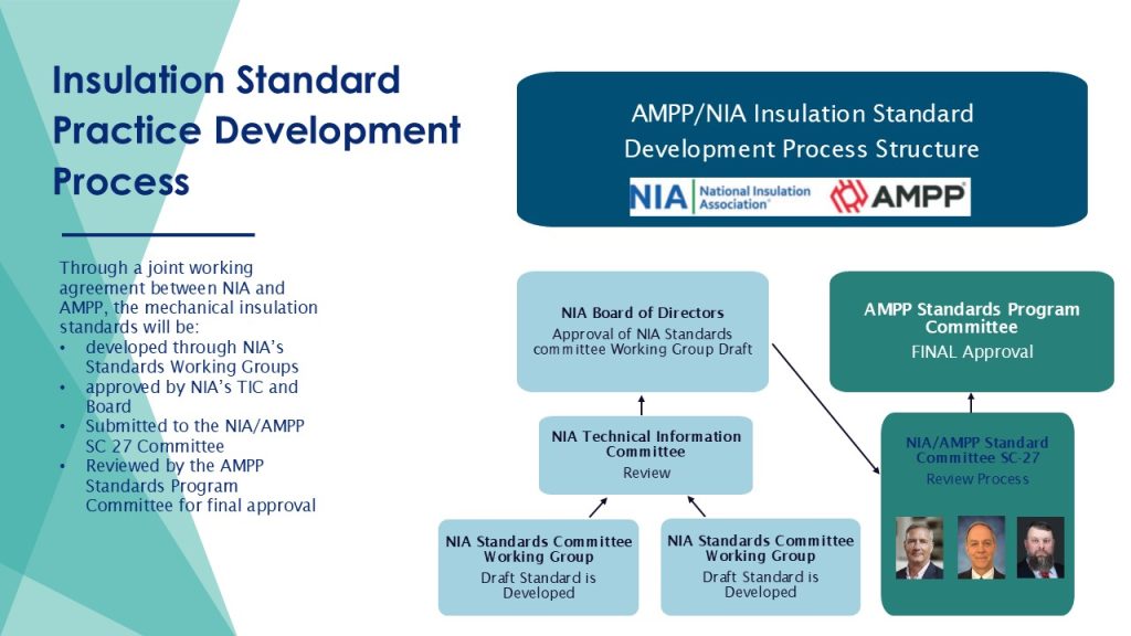 The suggested development of these Insulation Standard Practices will start with NIA and include an initial outline and draft, subject to an arduous review process through the NIA's Standards Committee and its Working Groups.* Once complete and approved by NIA's Technical Information Committee and Board of Directors, NIA will submit the draft standard to AMPP SC 27 for its review process. Suggested projects for SC 27 to consider can also originate from AMPP members or other industry stakeholders. At the end of that process, the draft of the AMPP Insulation Standard will be approved by the AMPP’s Standards Program Committee (SPC).